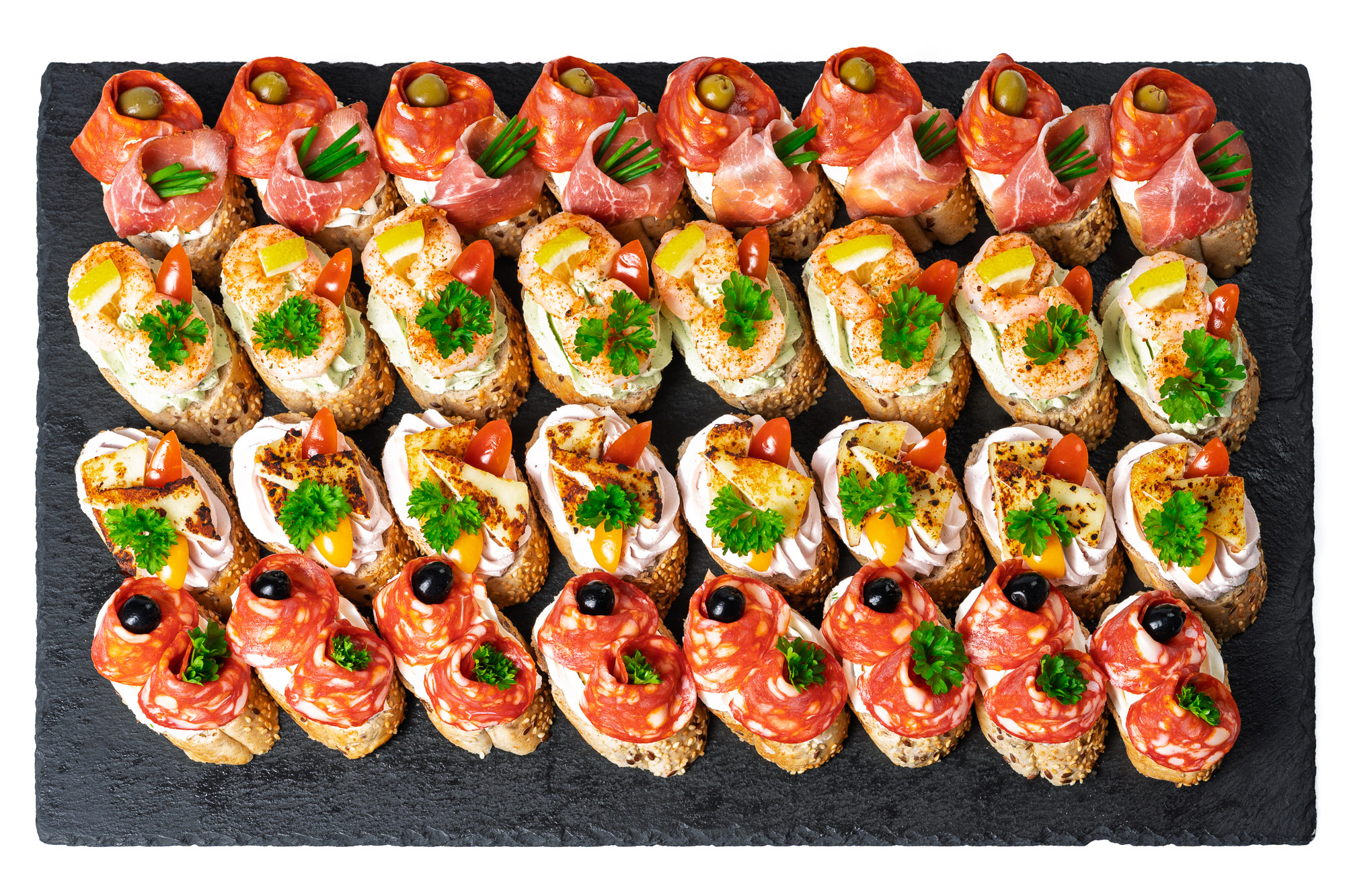 Bezlaktózové kanapky s parmskou šunkou, uzeným lososem a sýrem