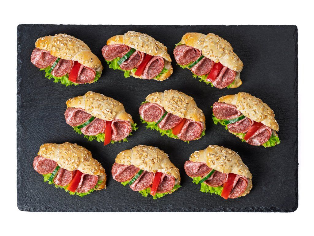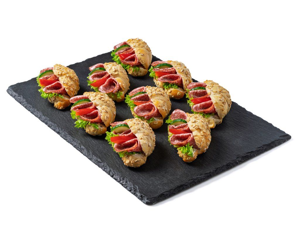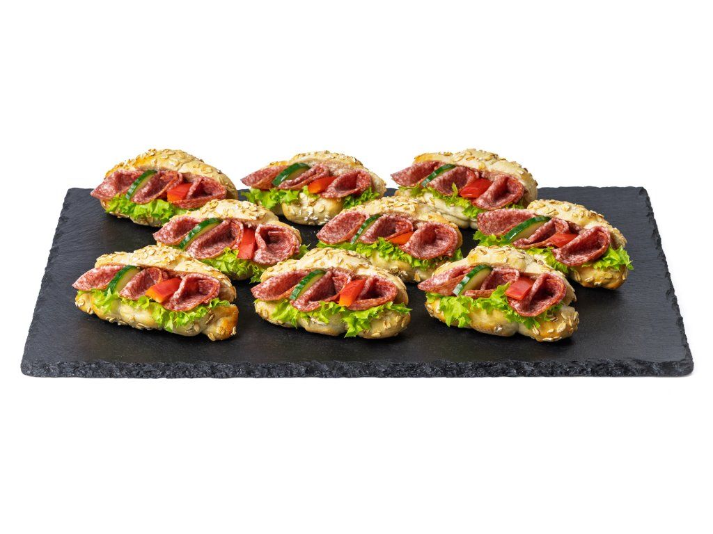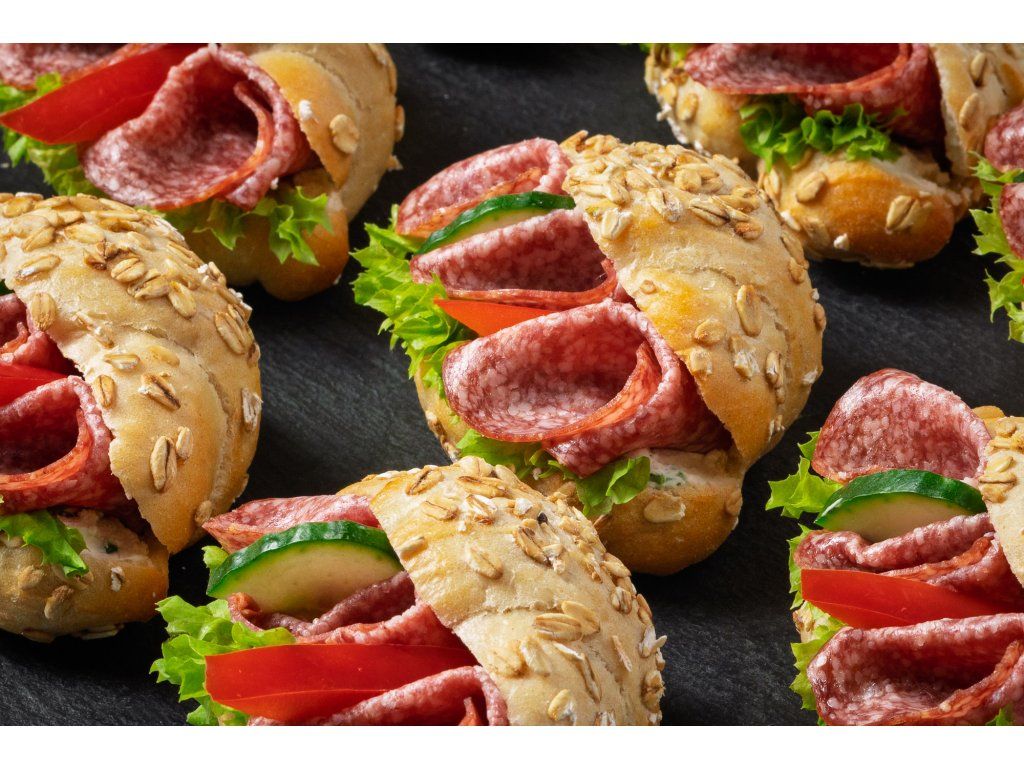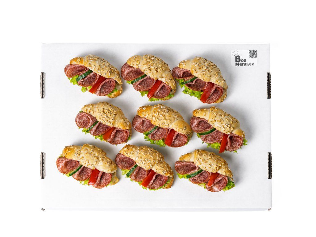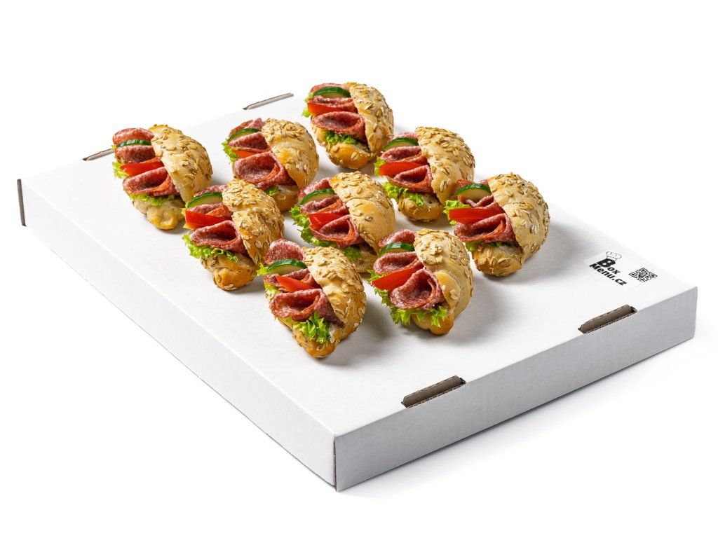 9 ks rohlíčků plněných salámem Herkules, salátem, paprikou, okurkou a pažitkovou pomazánkou