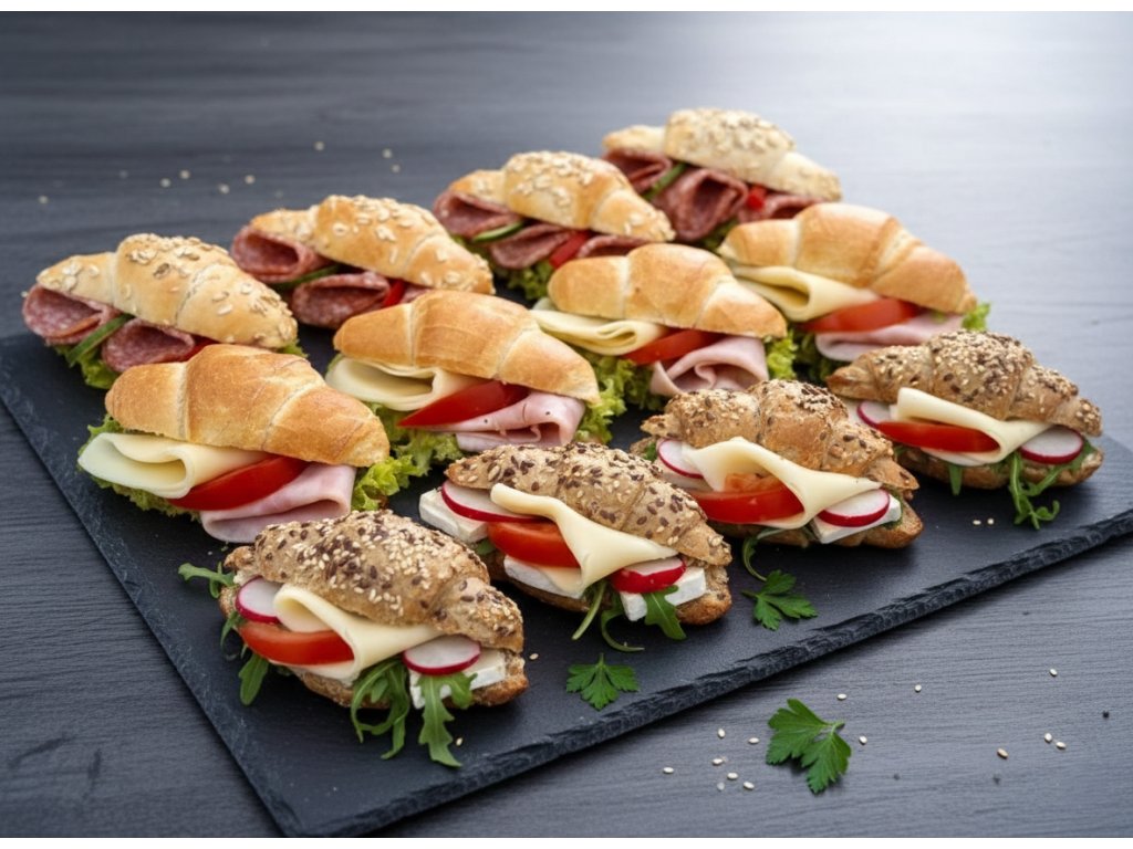 6 ks celozrnných rohlíčků plněných hermelínem, sýrem Gouda, rukolou, ředkvičkami. rajčetem a bazalkovou pomazánkou