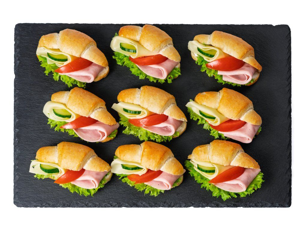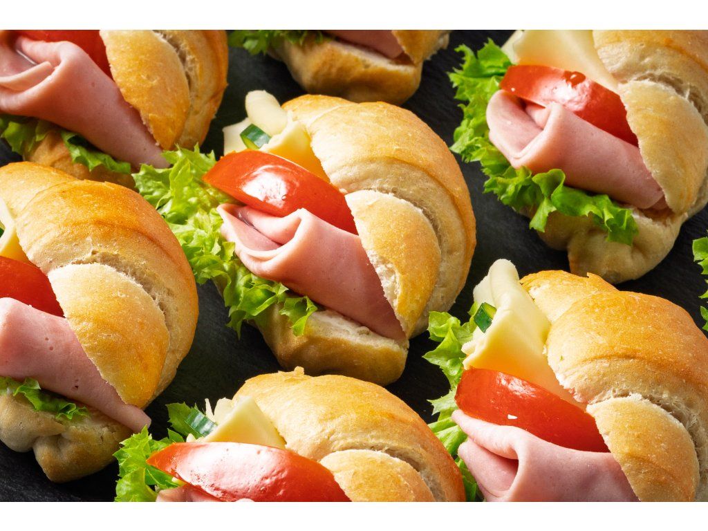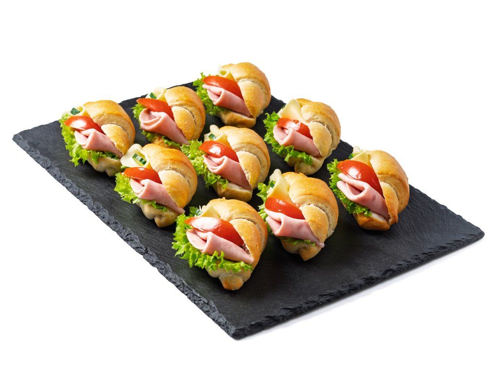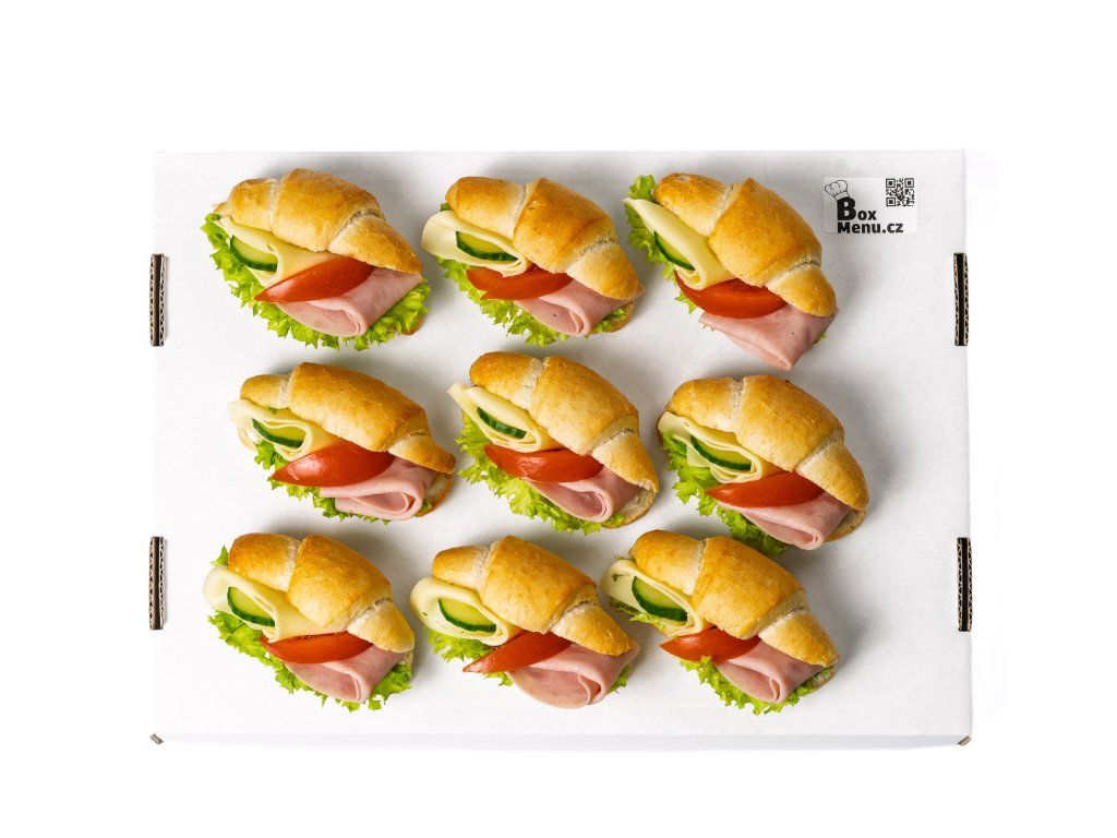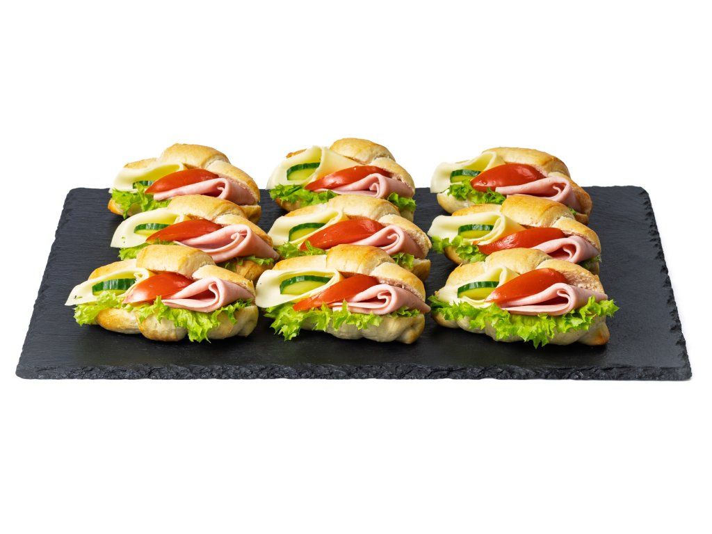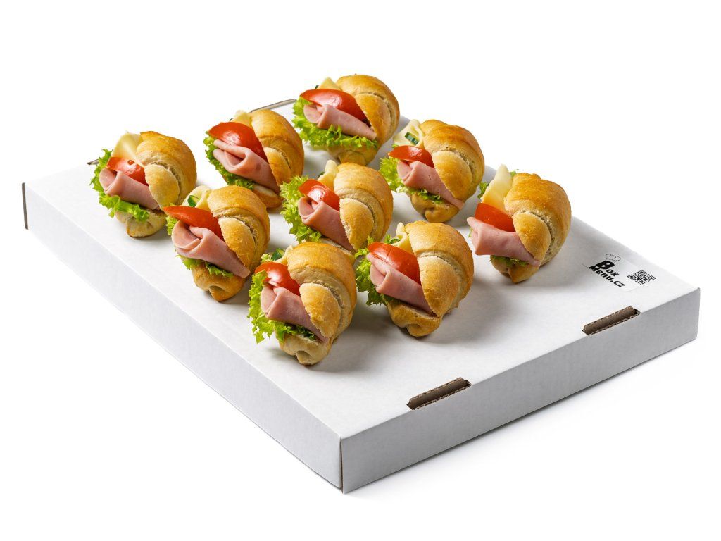18 ks rohlíčků plněných šunkou, sýrem Gouda, salátem, rajčetem a pomazánkou Budapešť