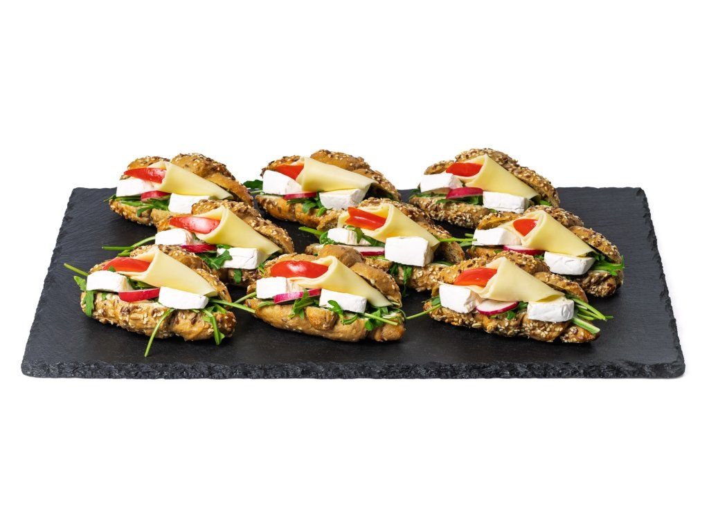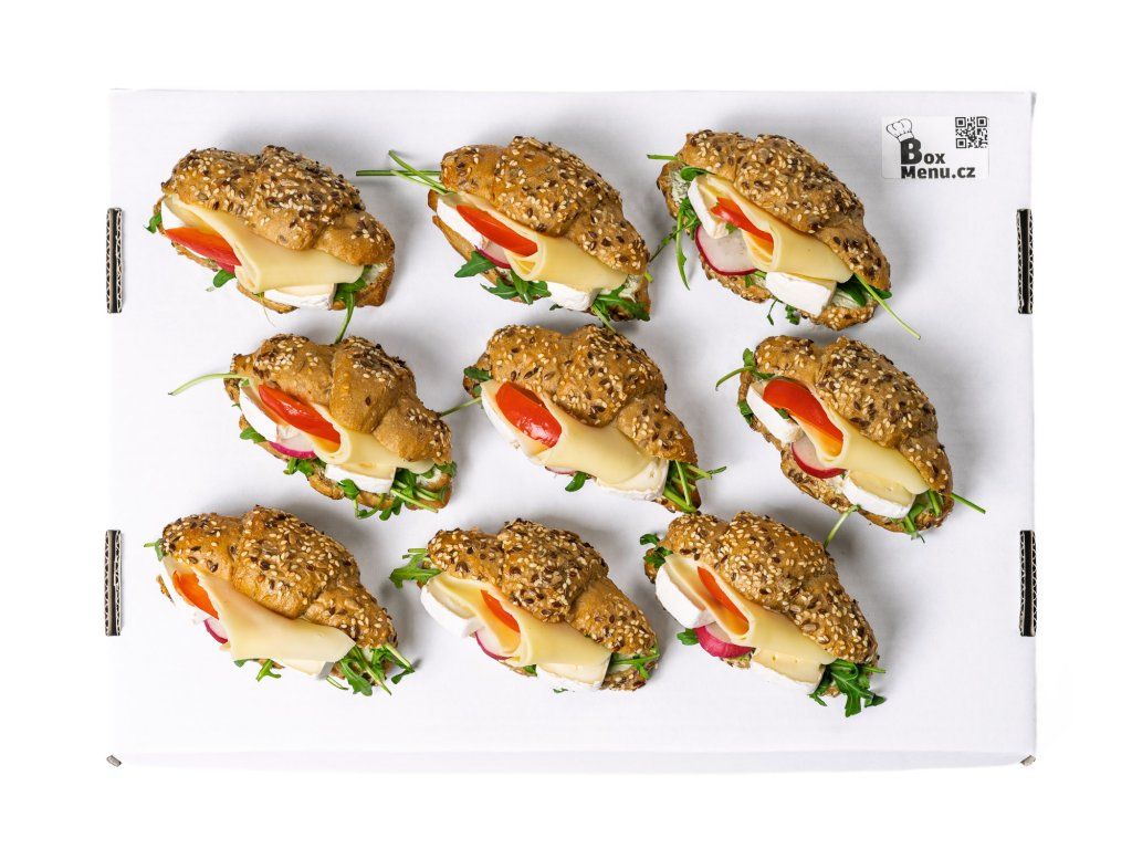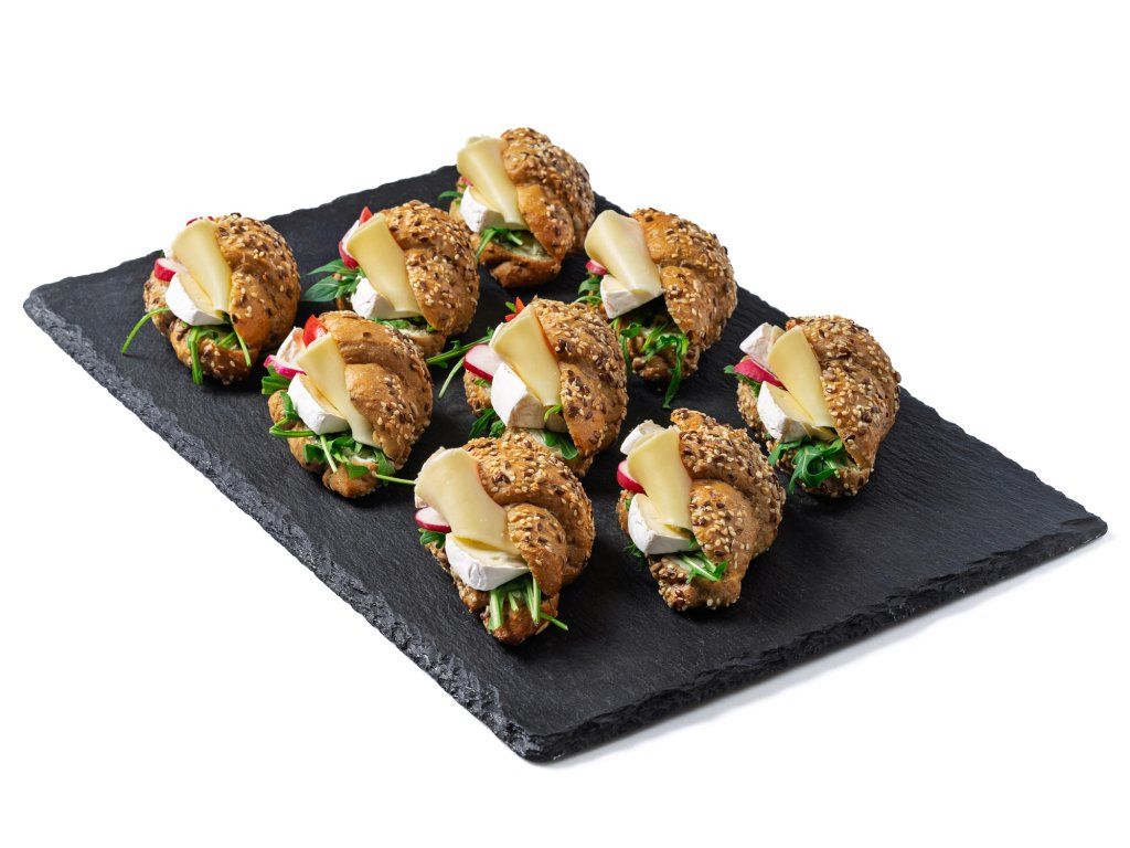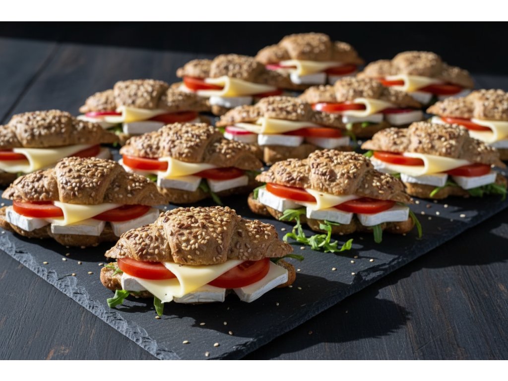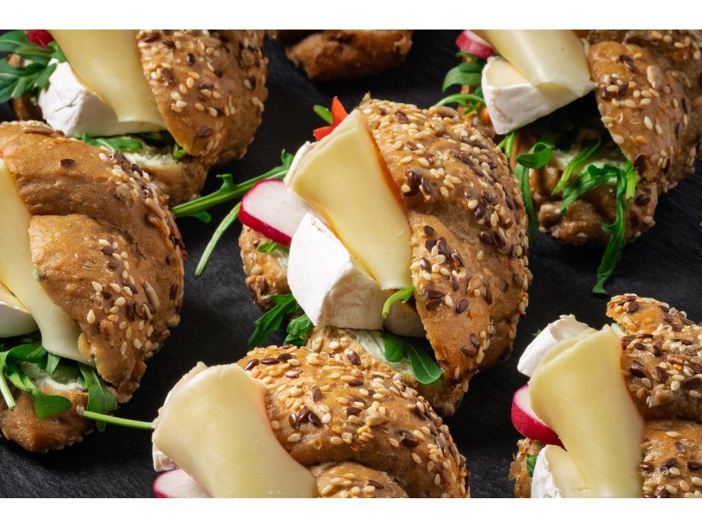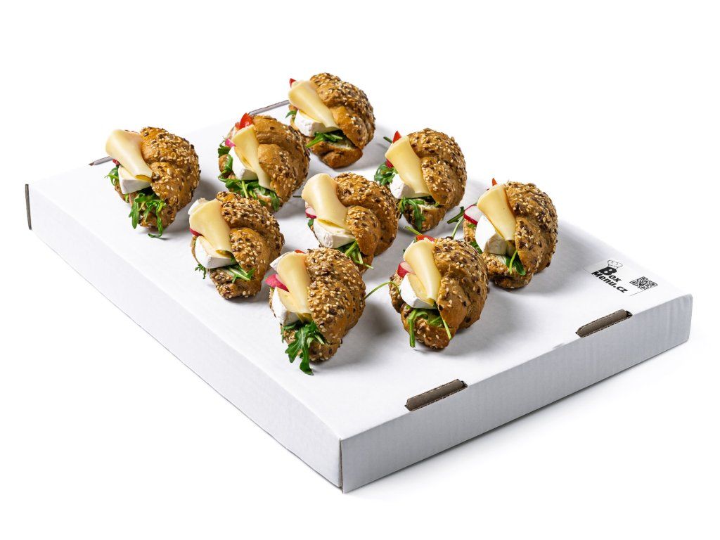 18 ks celozrnných rohlíčků plněných hermelínem, sýrem Gouda, rukolou, ředkvičkami. rajčetem a bazalkovou pomazánkou