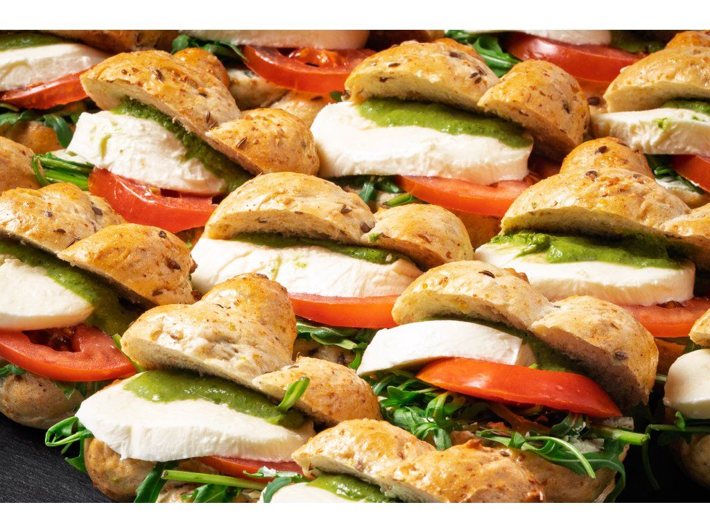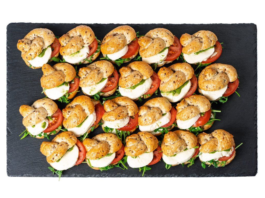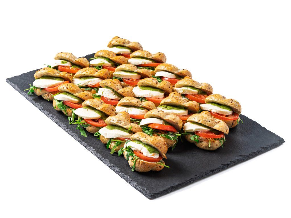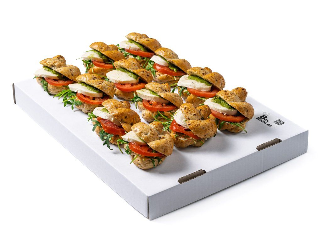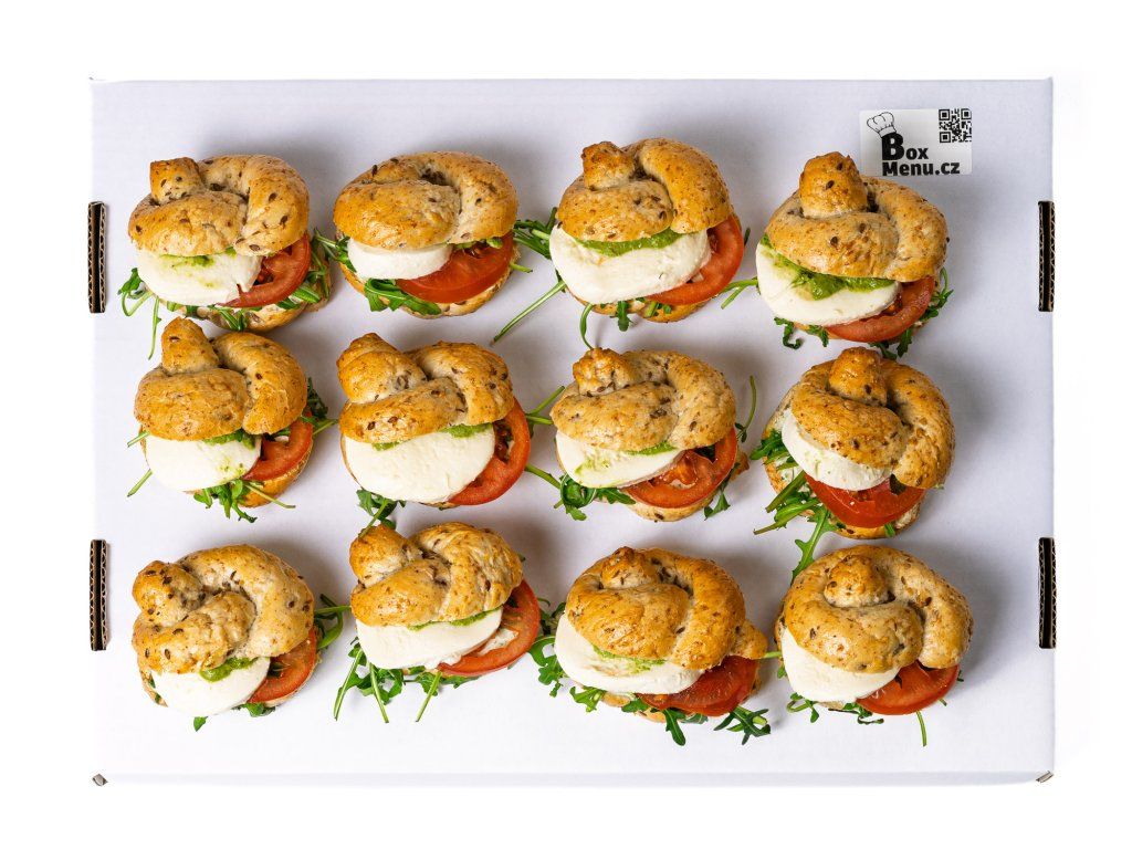 20 ks celozrnných banketek plněných rukolou, rajčaty, mozzarellou a bazalkovou pomazánkou