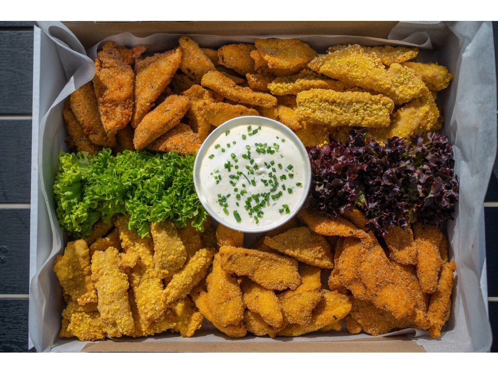 2 kg mix kuřecích stripsů obalených v kukuřičné strouhance s jemným pažitkovým dipem