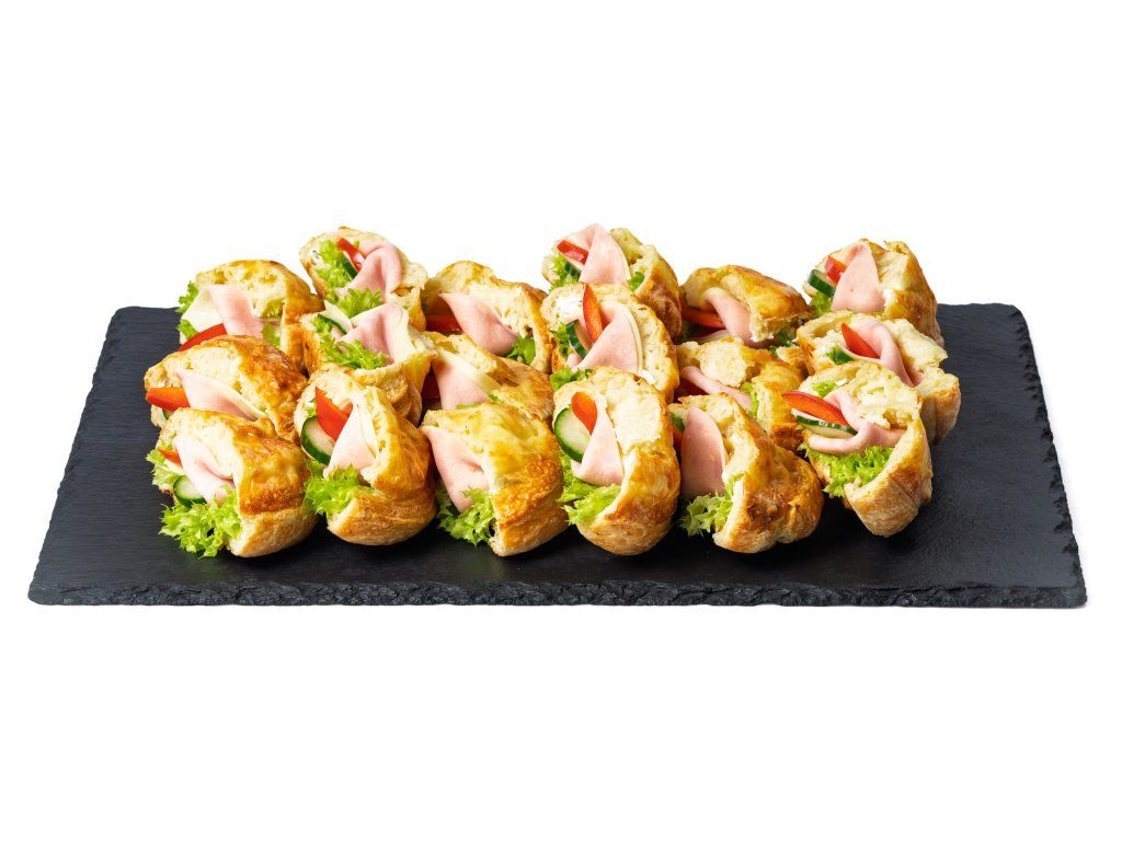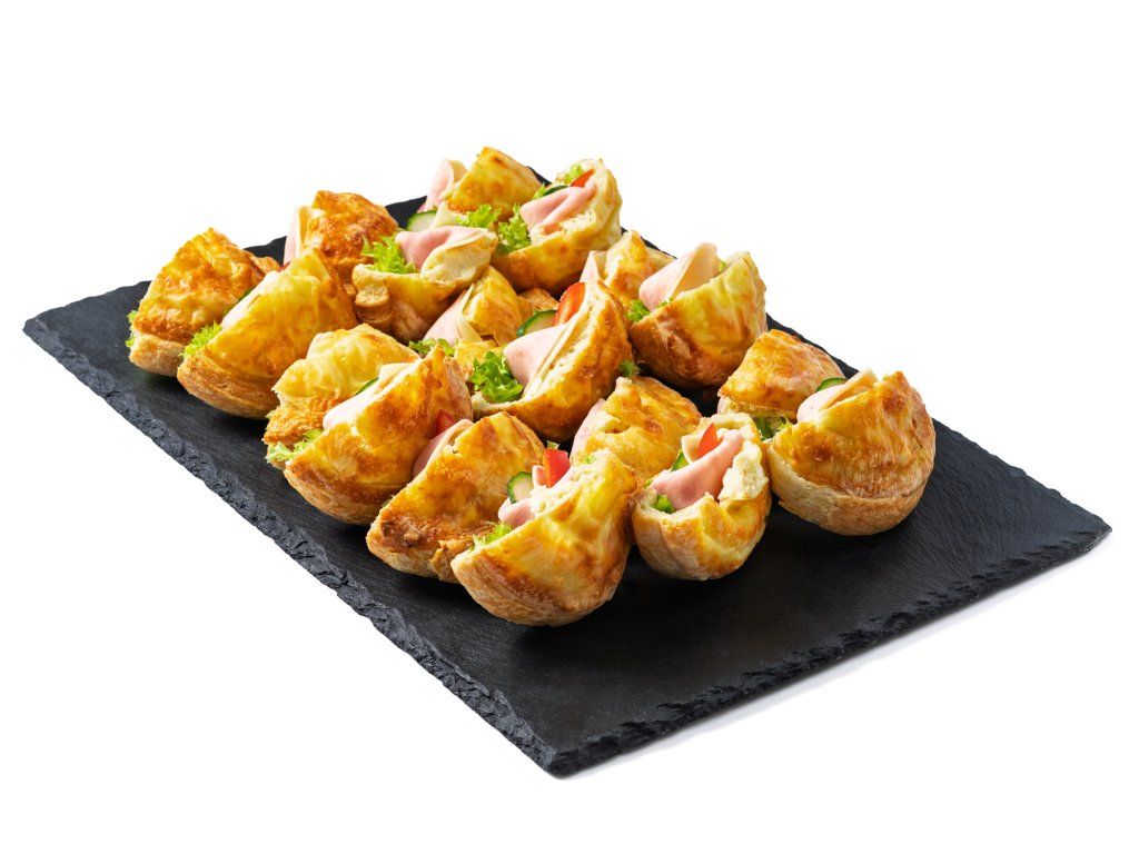 18 ks sýrový šnek, plněný šunkou, sýrem Gouda, salátem, paprikou, okurkou a pažitkovou pomazánkou