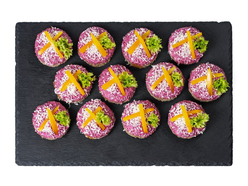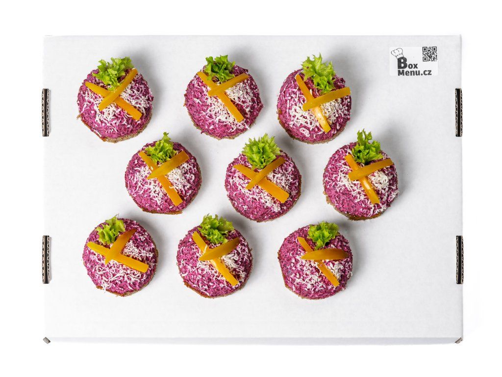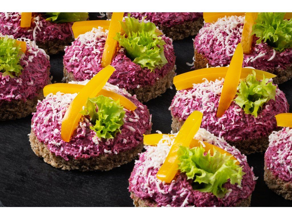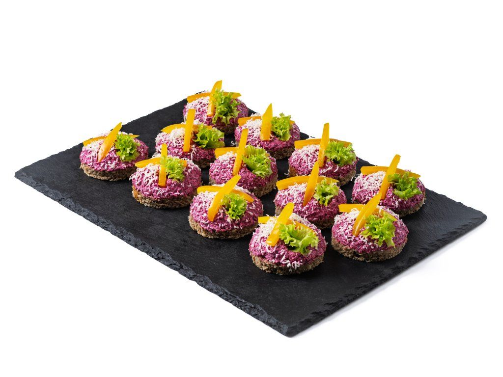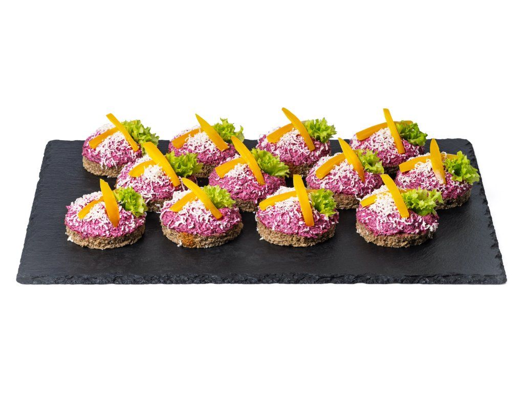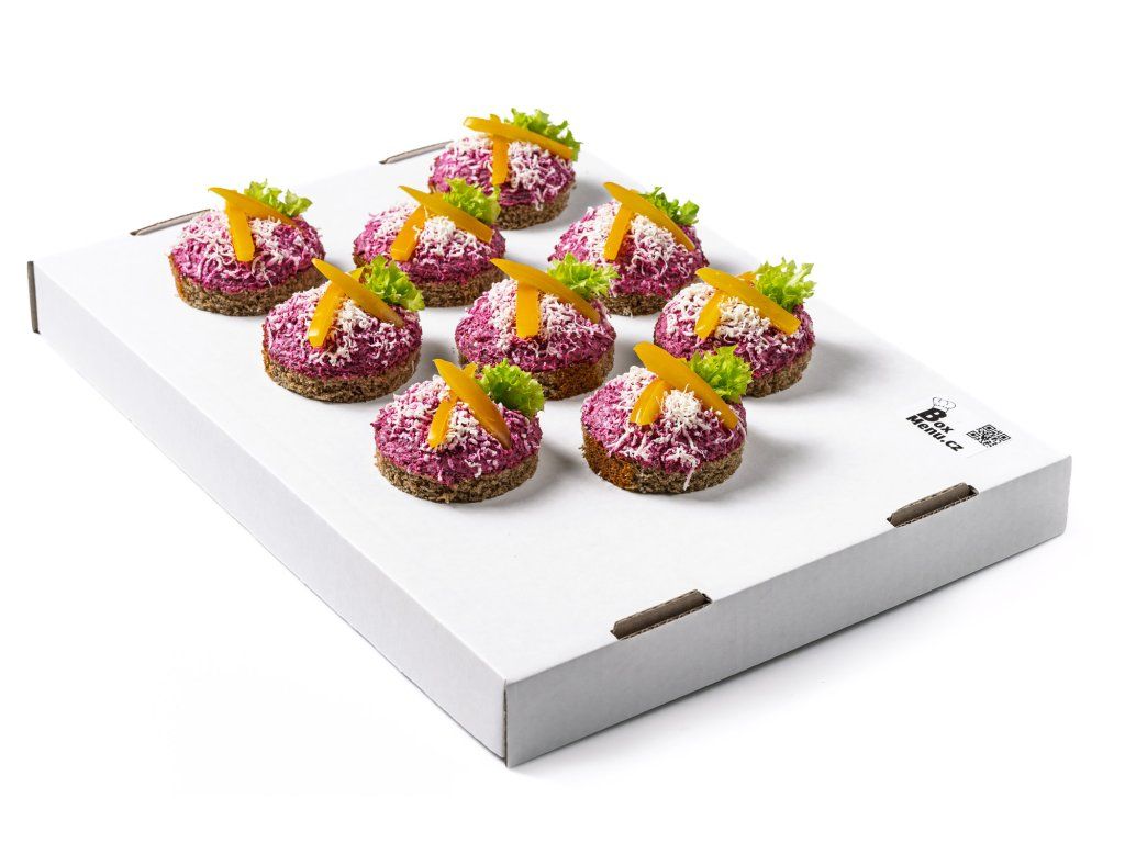 20 ks celozrnných chlebíčků s řepovou pomazánkou, balkánským sýrem a zeleninou