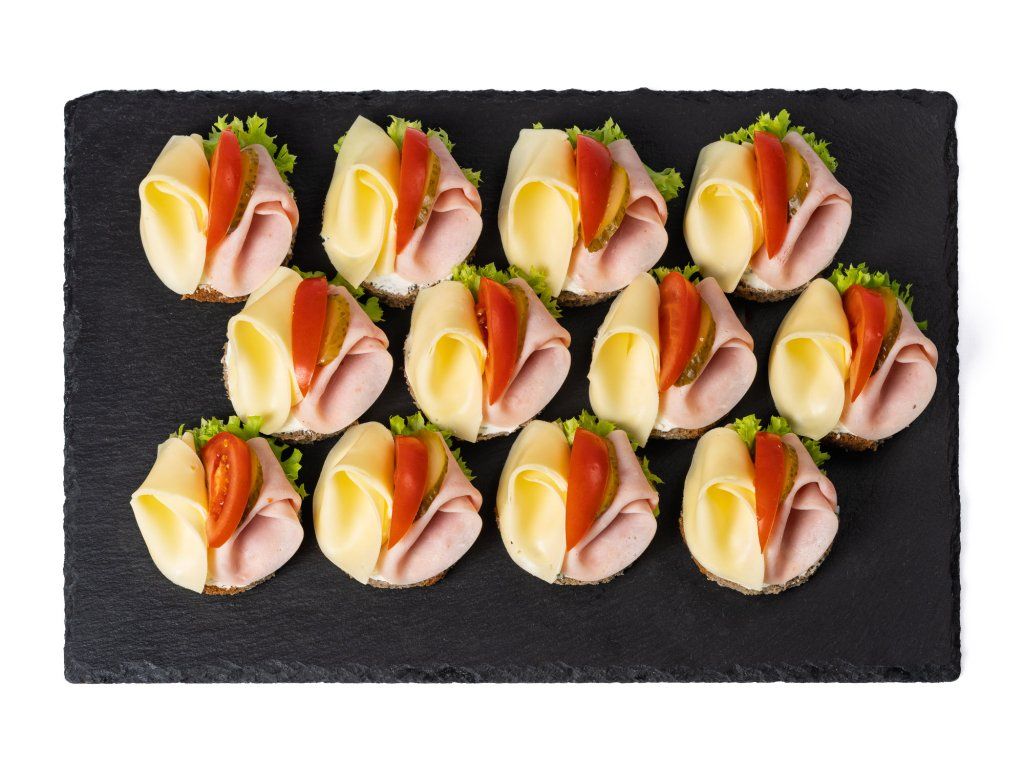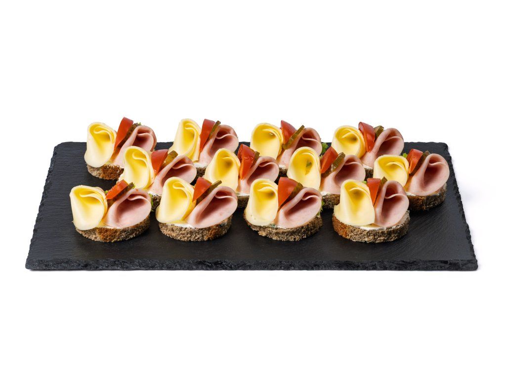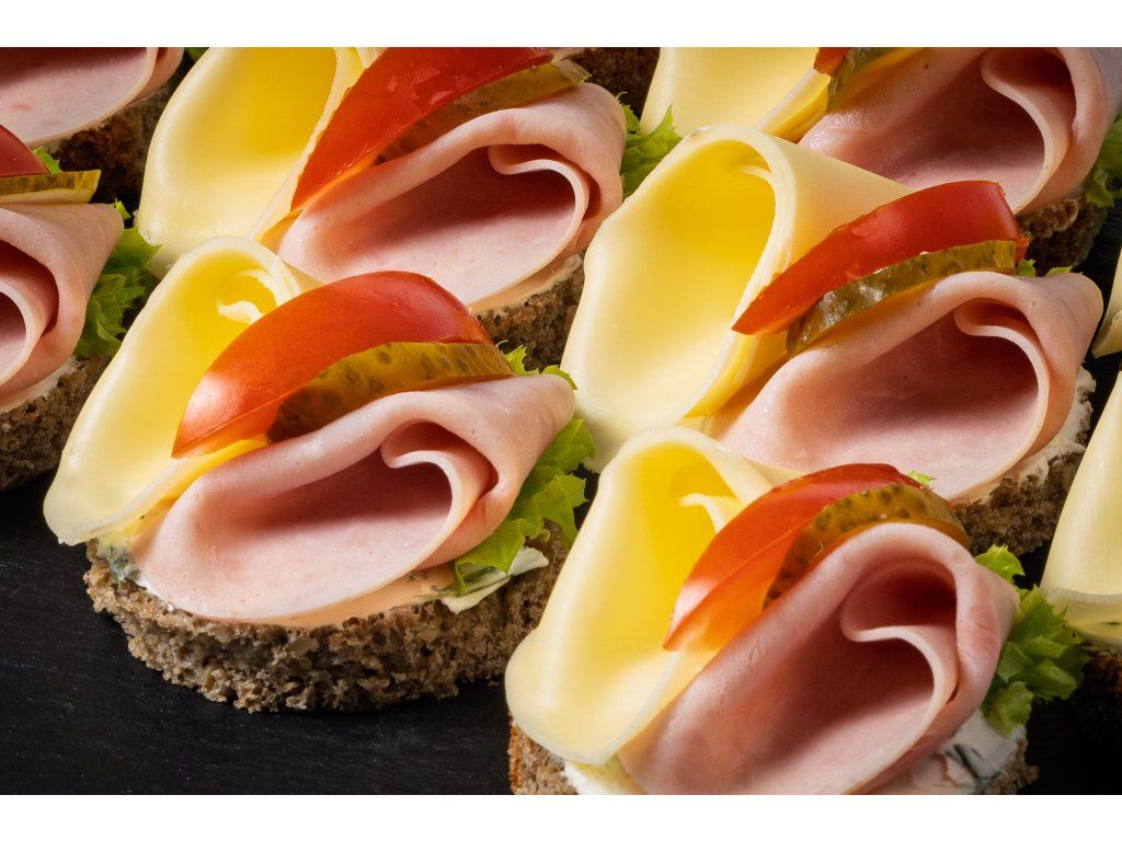 20 ks celozrnných chlebíčků se šunkou, sýrem, zeleninou a pažitkovou pomazánkou