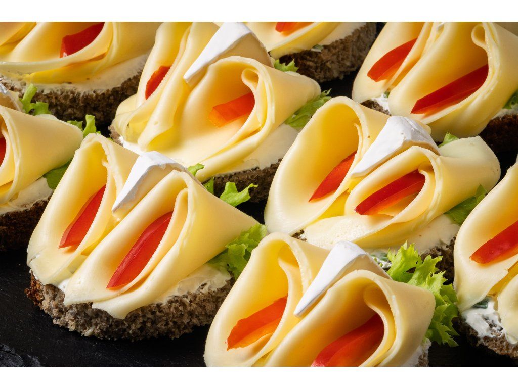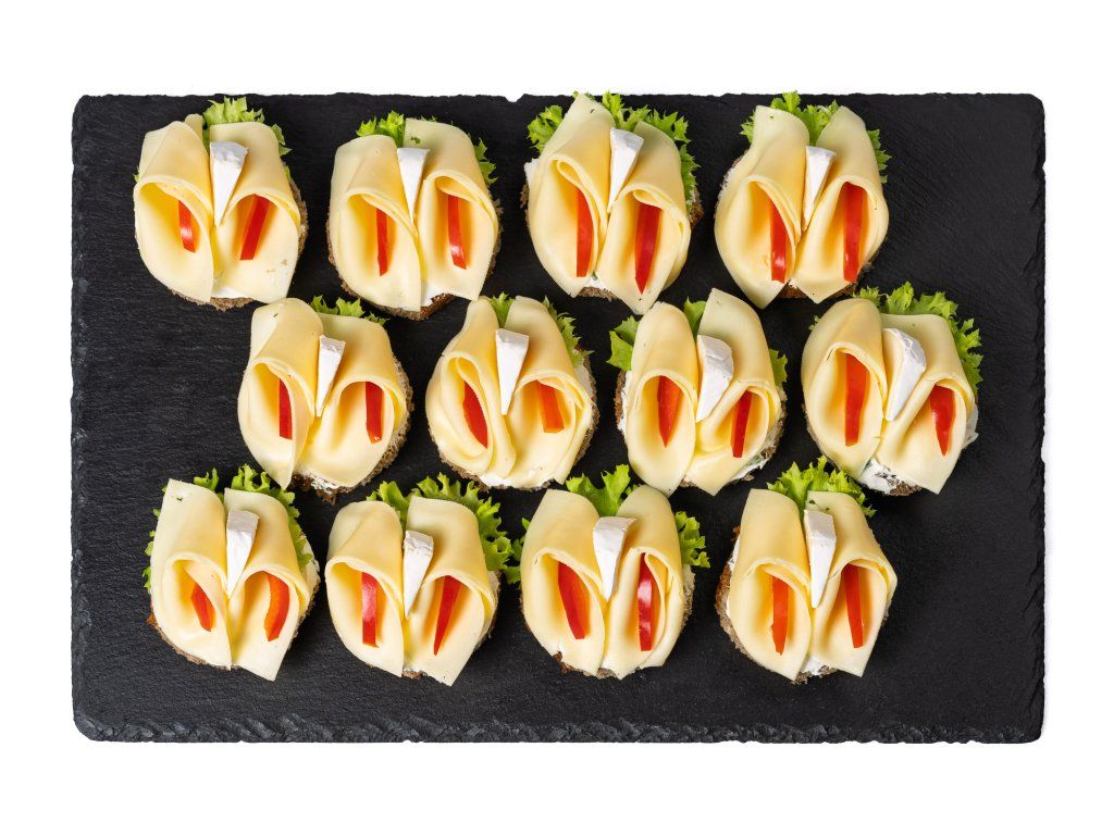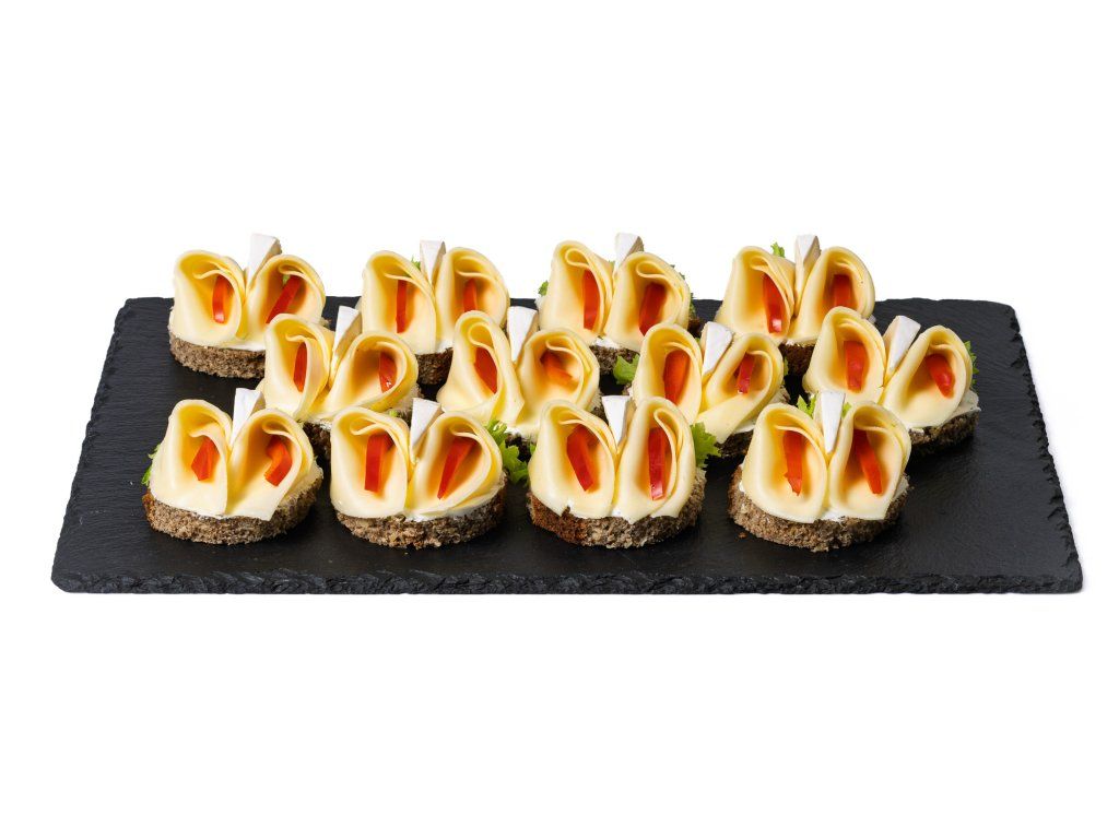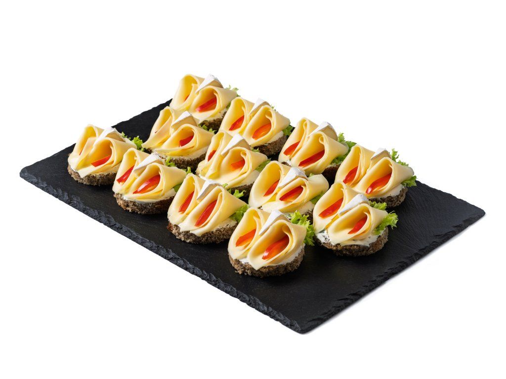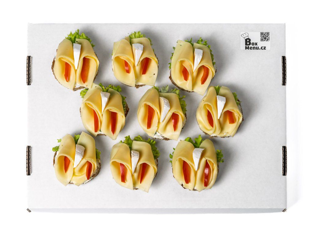 20 ks celozrnných chlebíčků se sýrem, hermelínem, zeleninou a pažitkovou pomazánkou