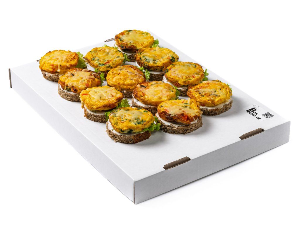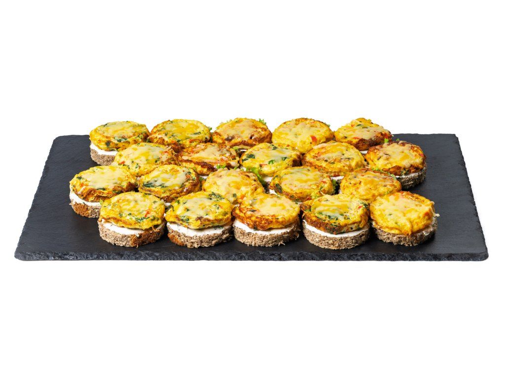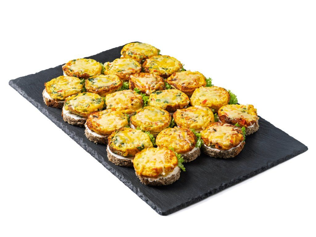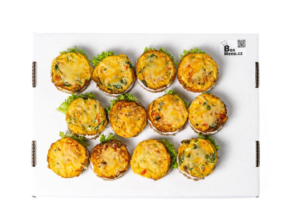 10x mini slaninová frittata s jarní cibulkou, kousky papriky a rajčat, podávaná na bezlepkovém chlebu s pomazánkou ze sušených rajčat