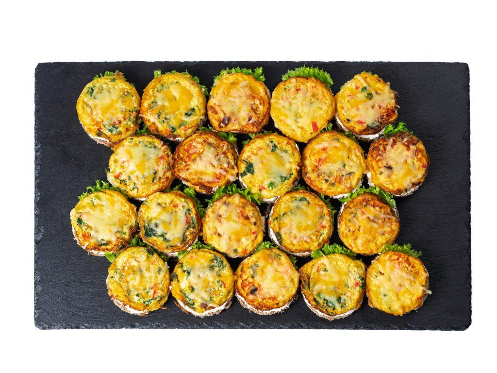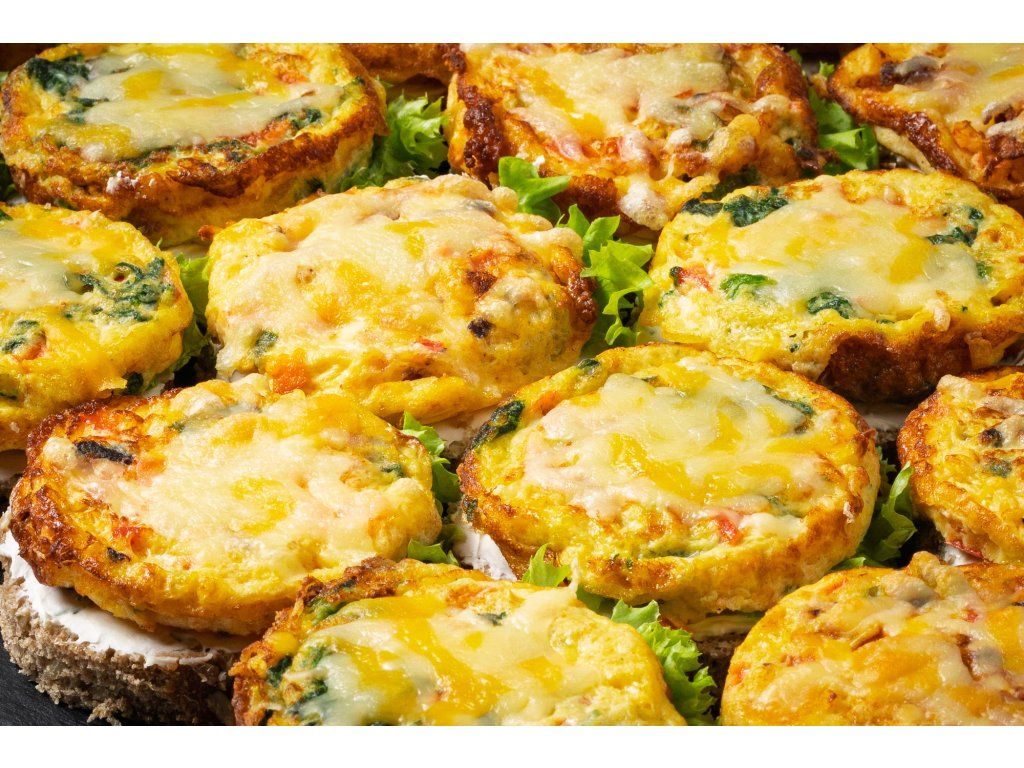 10x mini špenátová frittata se sýrem cheddar, paprikou a rajčaty, podávaná na vícezrnném chlebu s pažitkovou pomazánkou