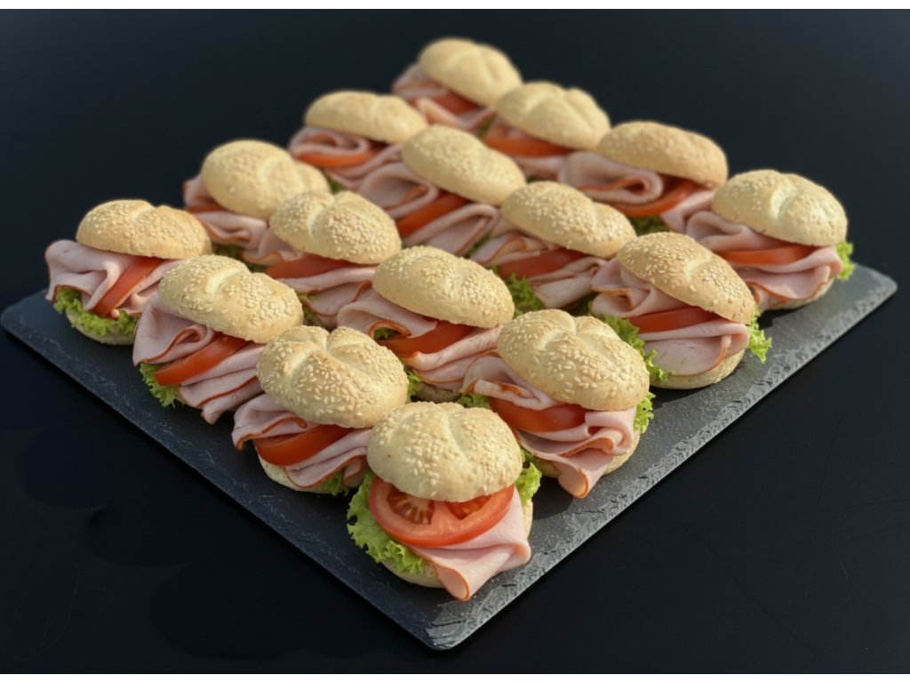 20 ks mini sezamových kaiserek plněných debrecínkou, salátem, rajčetem a pomazánkou Budapešť