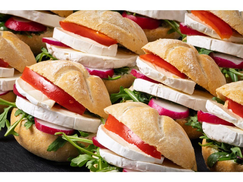 20 ks mini kaiserek plněných hermelínem, rukolou, ředkvičkou, paprikou a bazalkovou pomazánkou