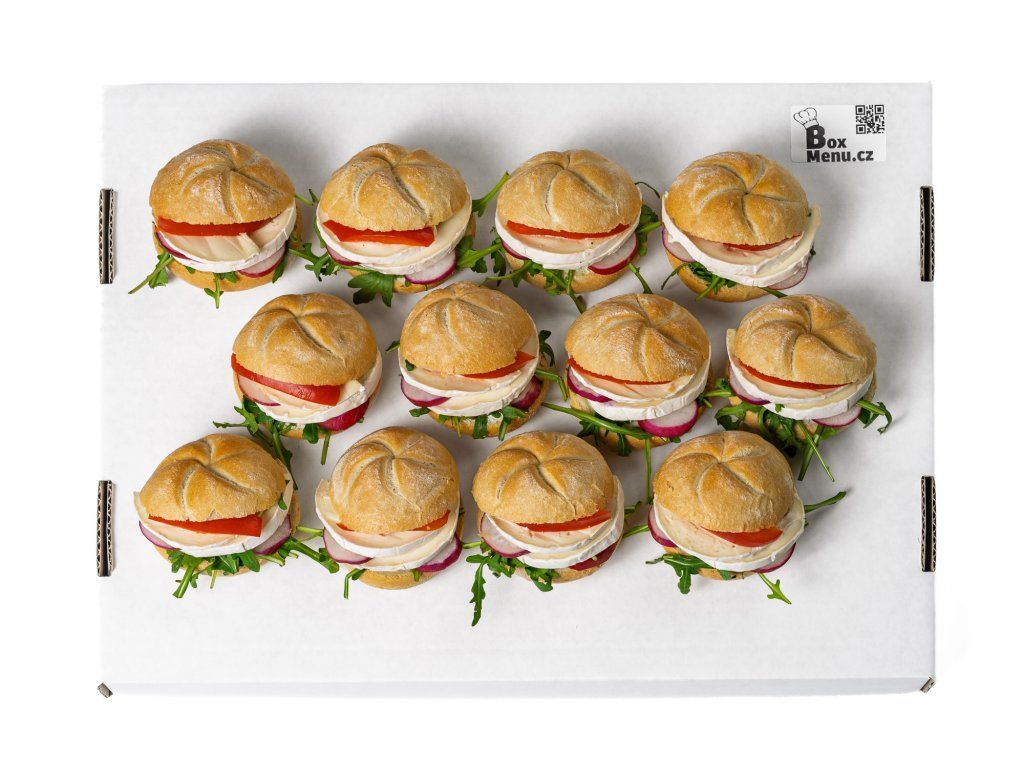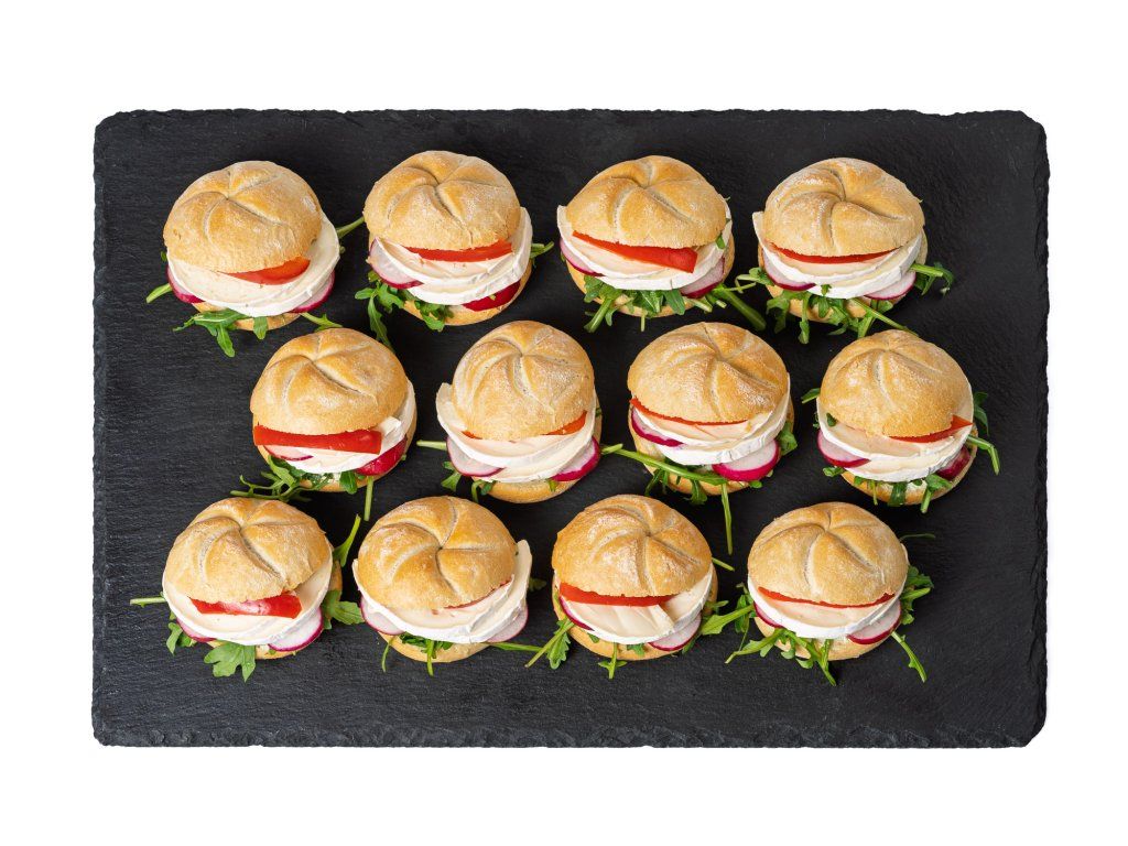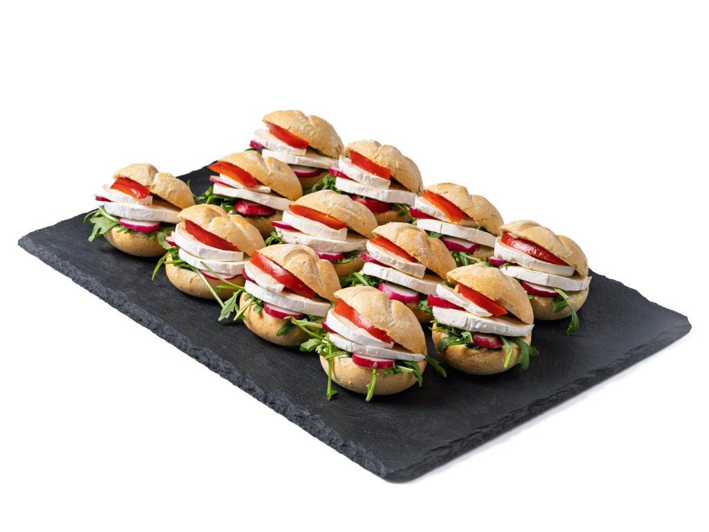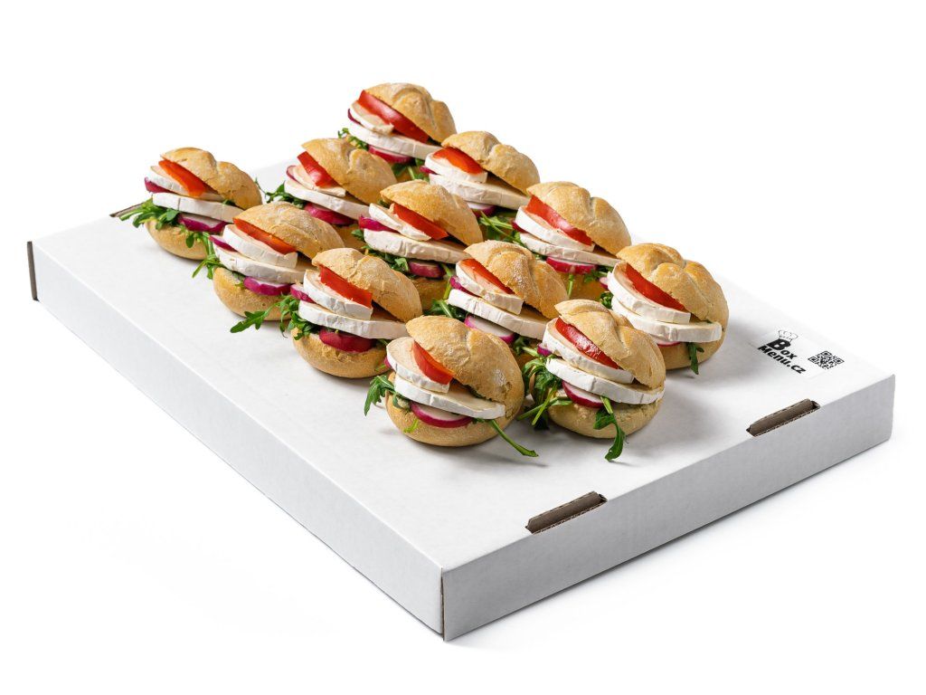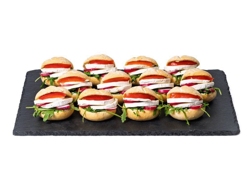 12 ks mini kaiserek plněných hermelínem, rukolou, ředkvičkou, paprikou a bazalkovou pomazánkou