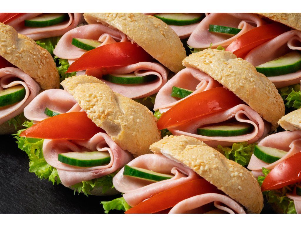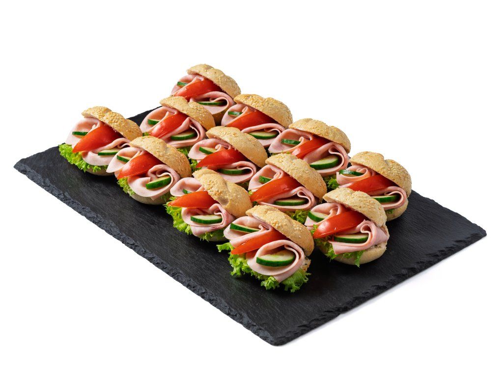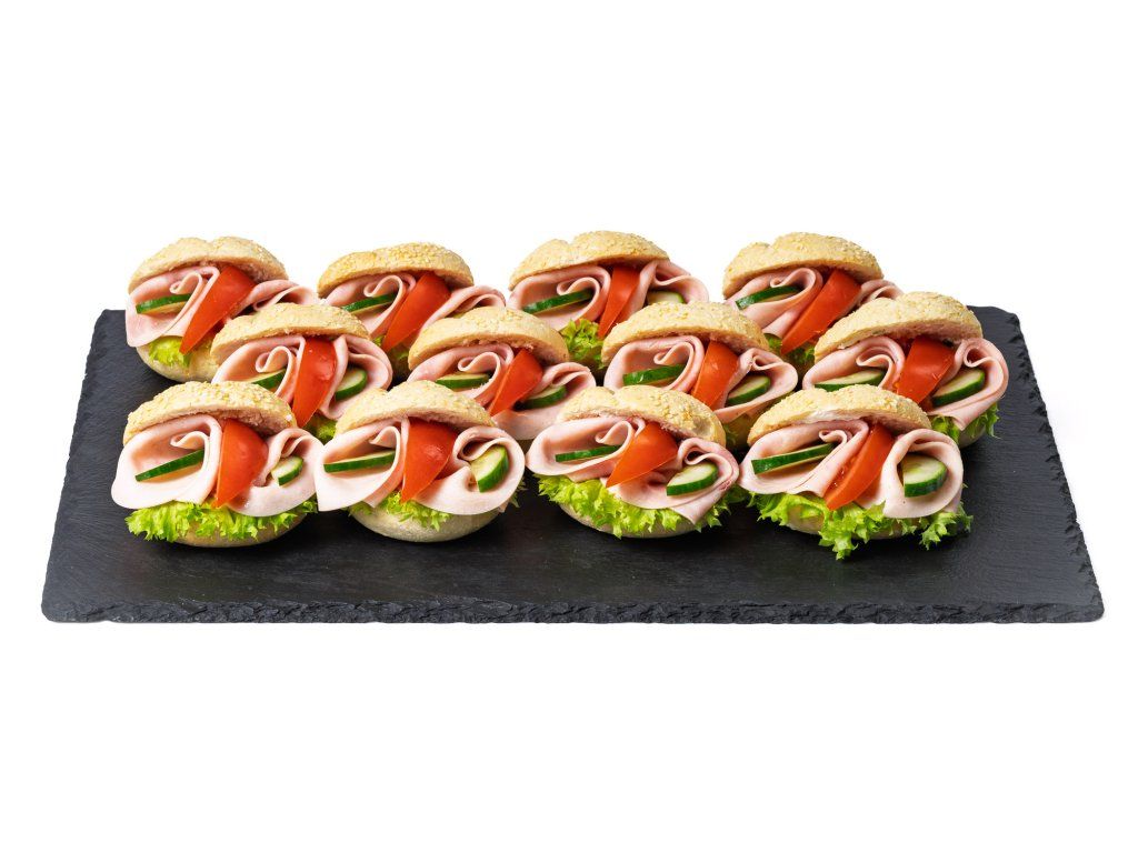 20 ks mini sezamových kaiserek plněných šunkou, salátem, rajčetem a pomazánkou Budapešť