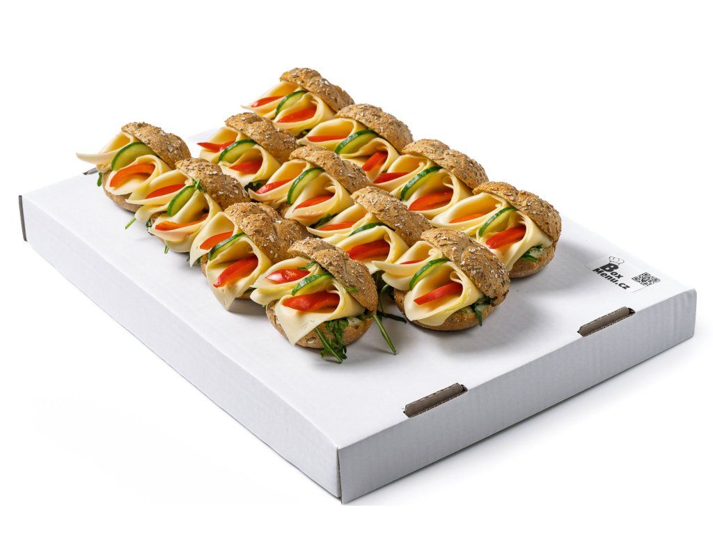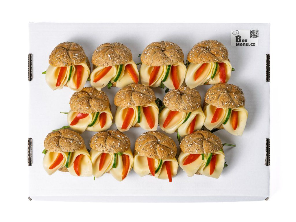 12 ks mini celozrnných kaiserek plněných sýrem Gouda, paprikou, rukolou a pomazánkou Budapešť