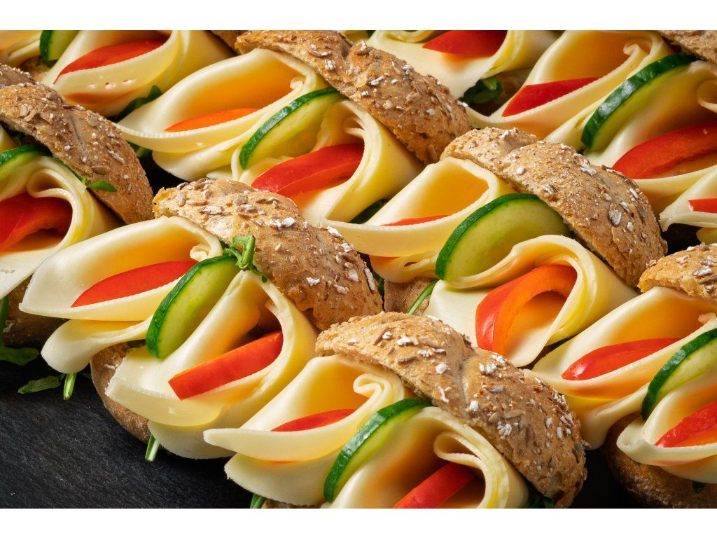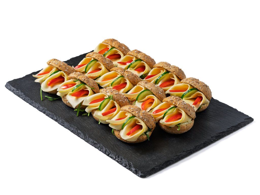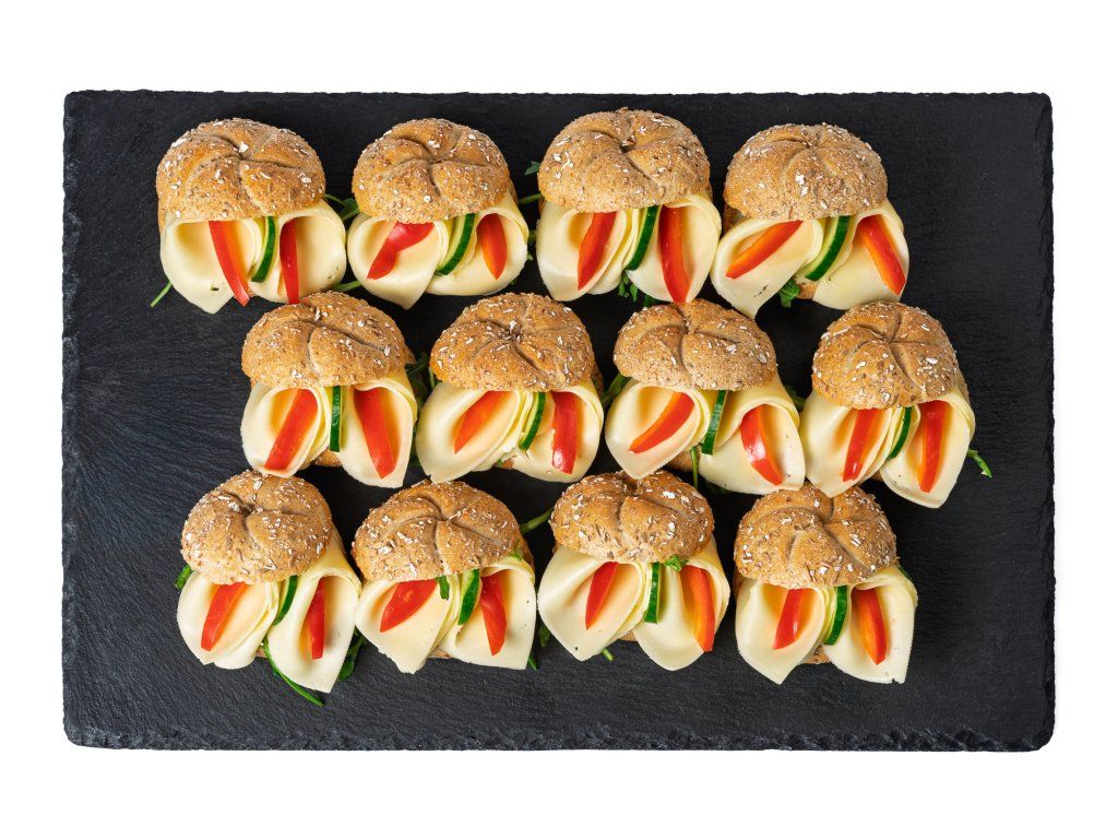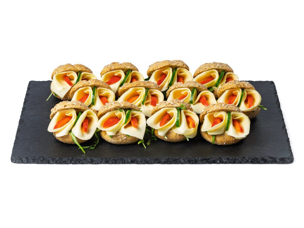 20 ks mini celozrnných kaiserek plněných sýrem Gouda, paprikou, rukolou a bazalkovou pomazánkou