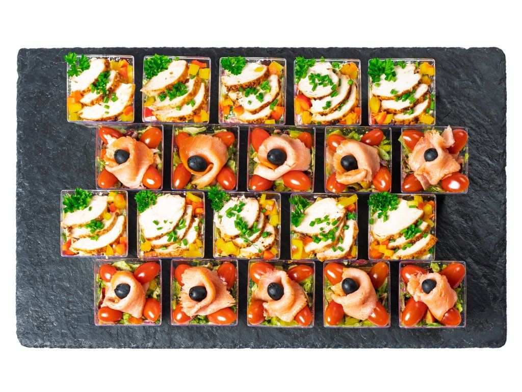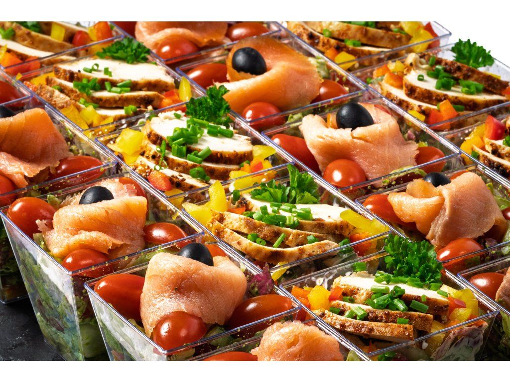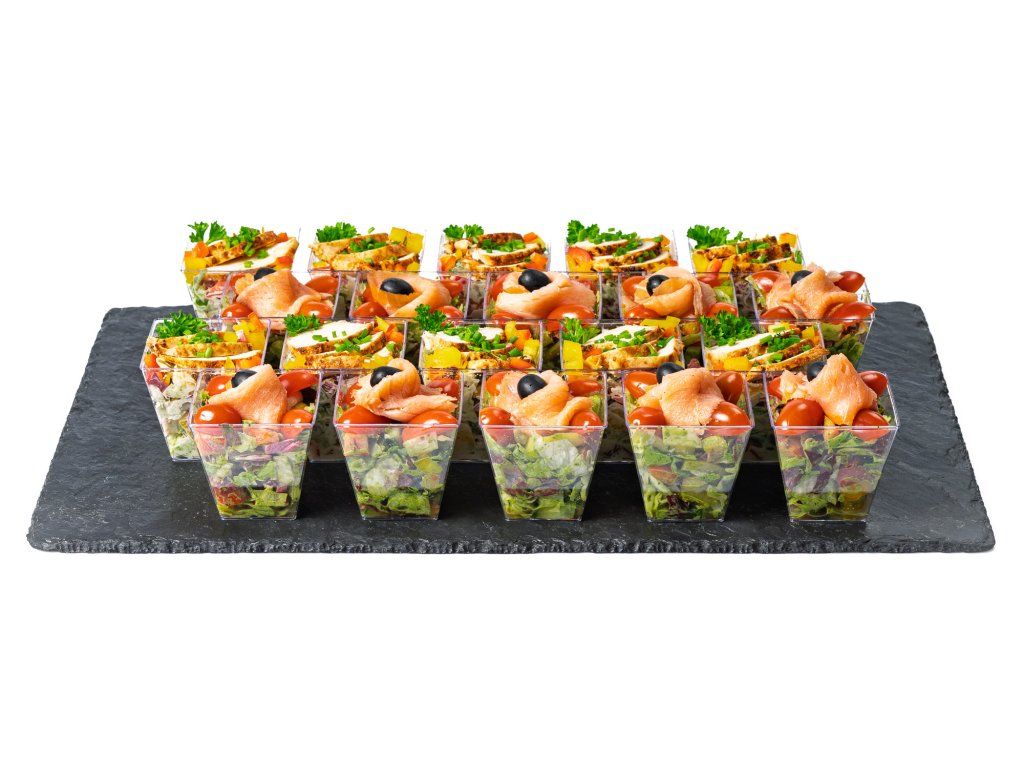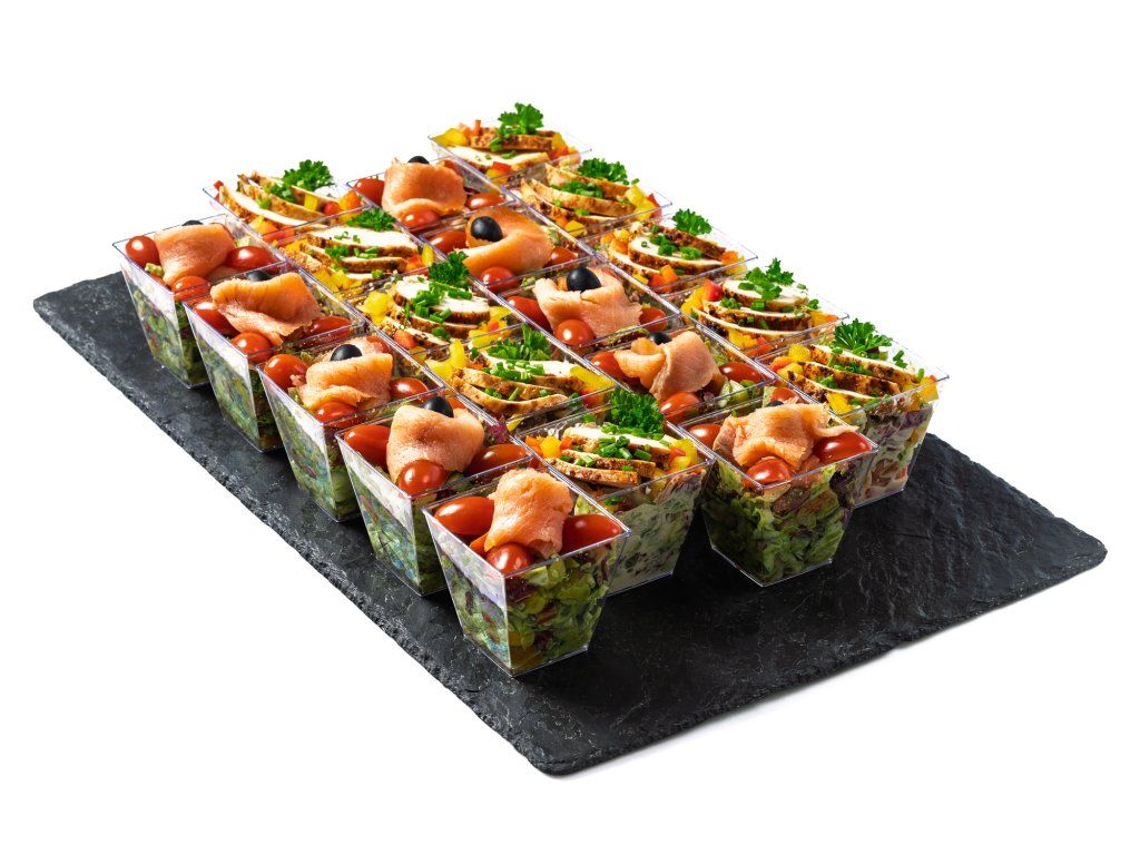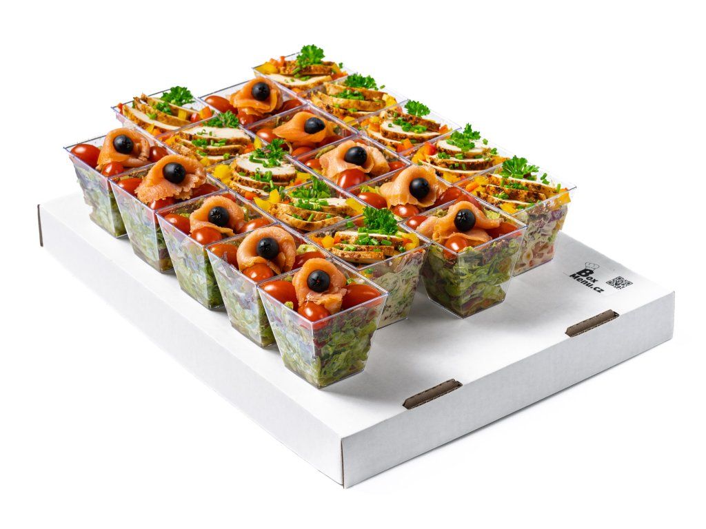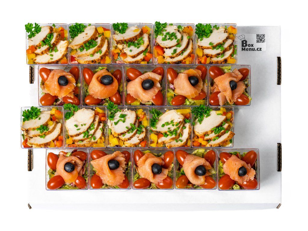 6 ks zeleninový salát s uzeným lososem, cherry rajčaty, černou olivou a bazalkovým pestem
