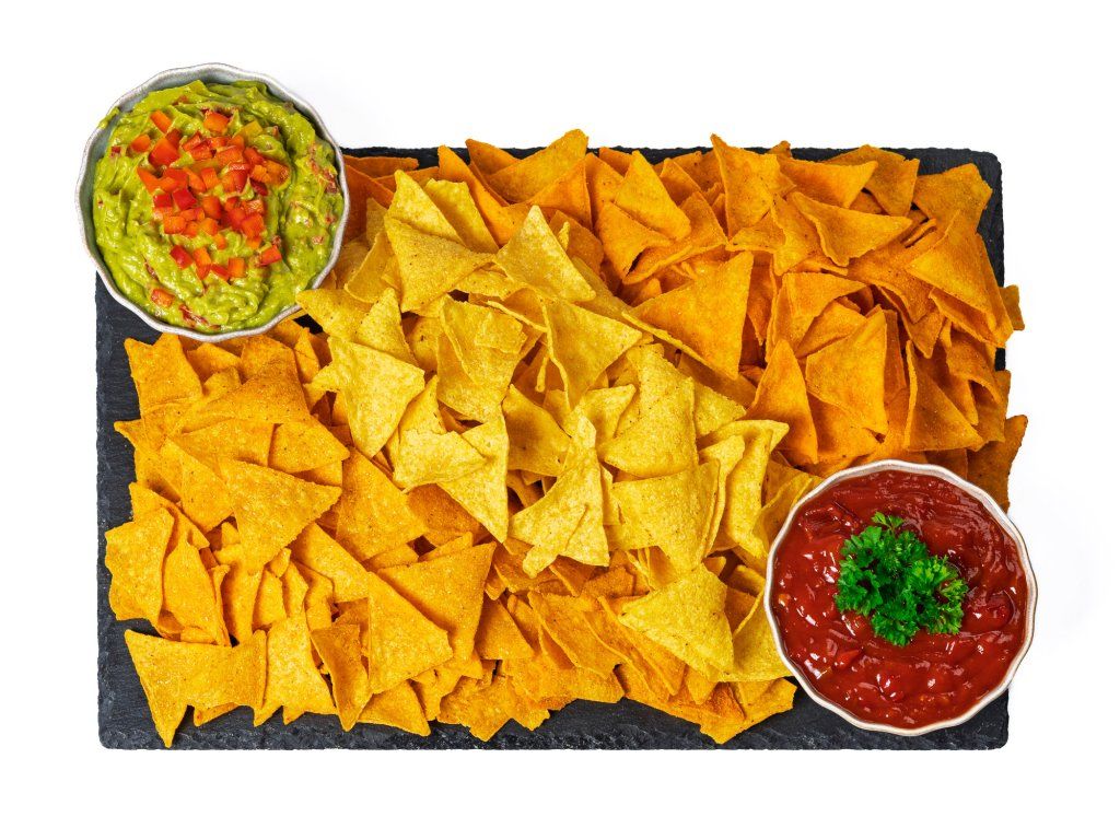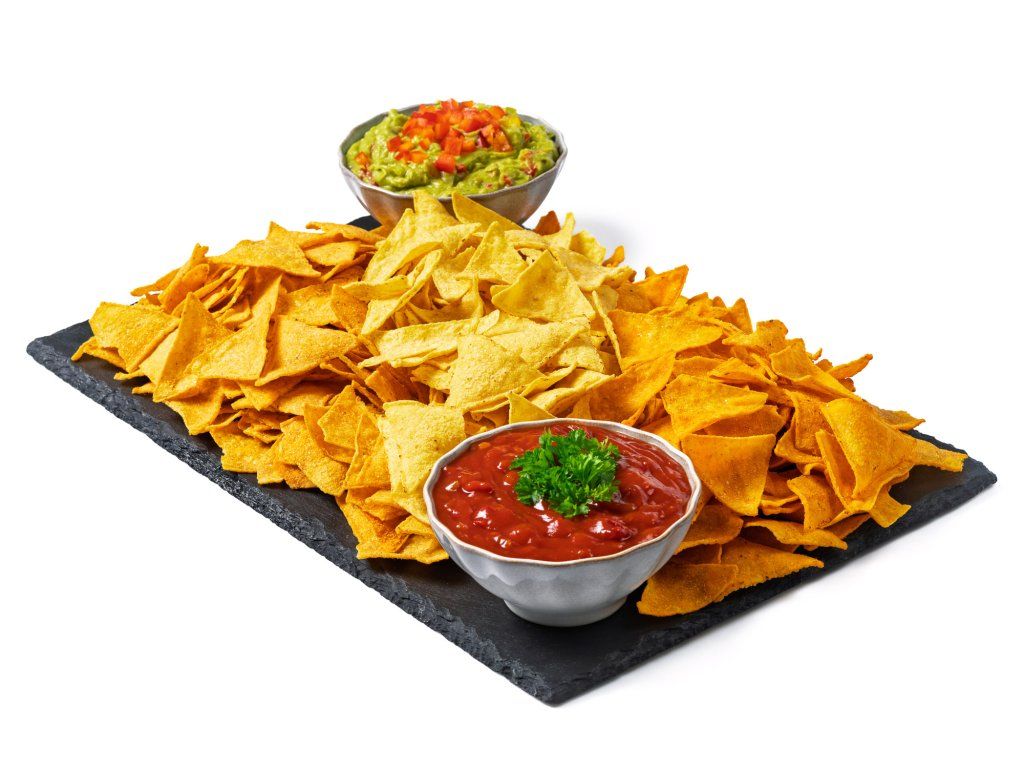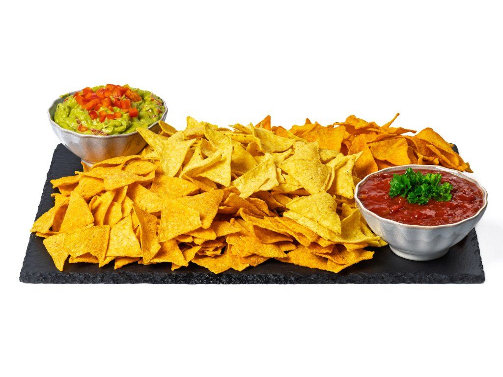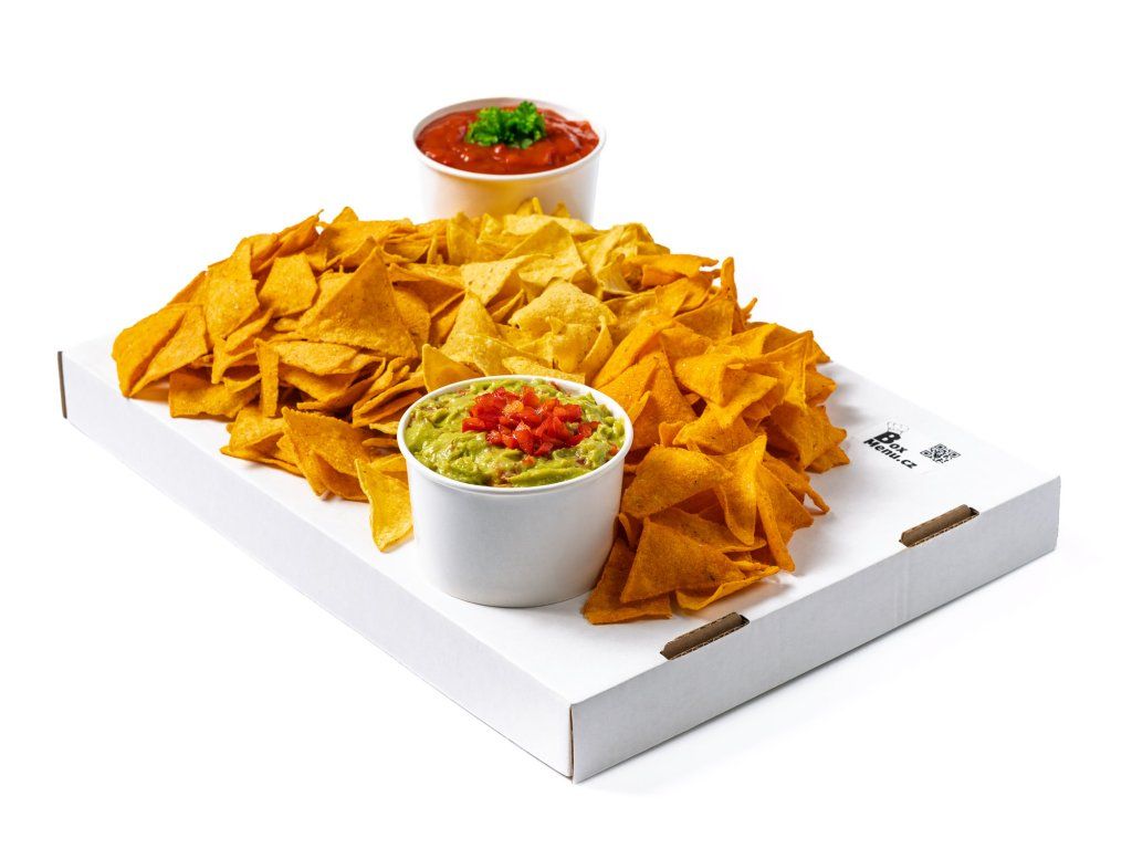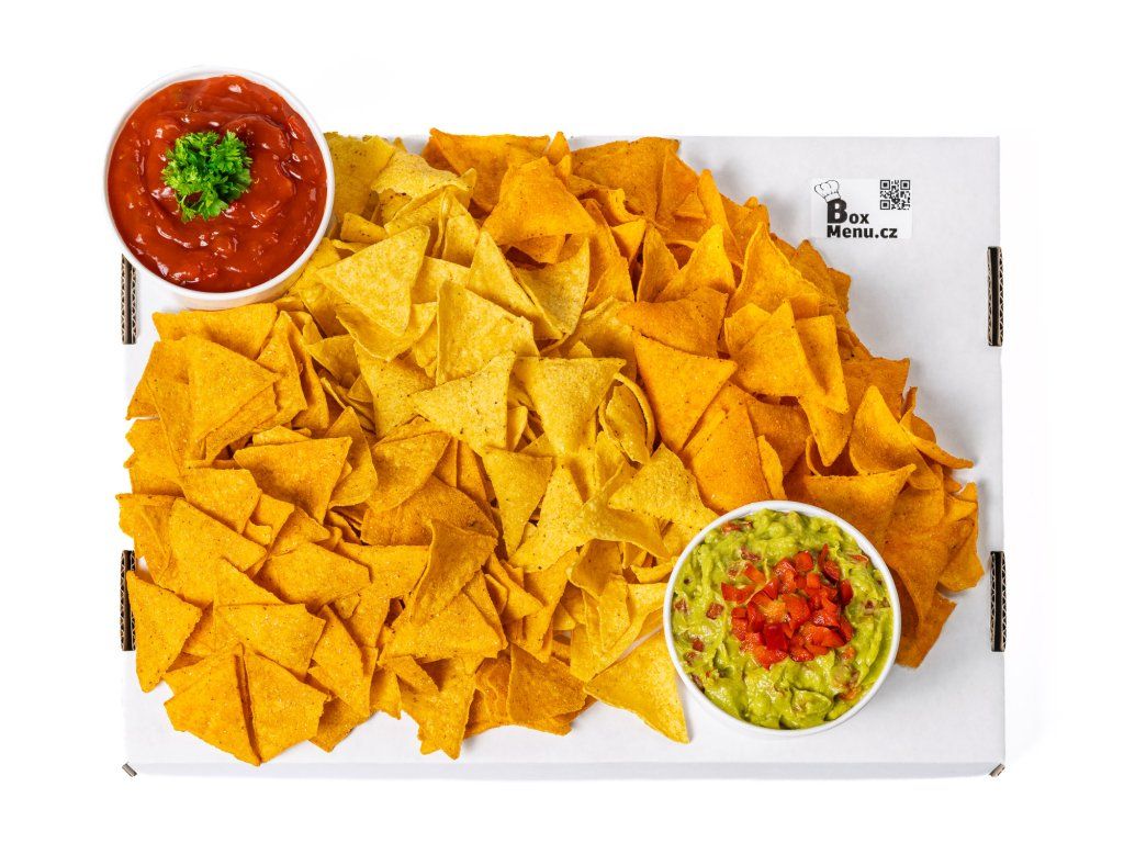 Naše tři druhy nachos s avokádovým dipem a rajčatovou salsou jsou ideální doplněk k jakémukoliv jiném boxu do středu stolu.