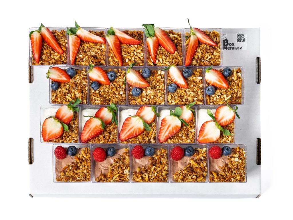 5x jahodové smoothie, domácí granola, ovoce