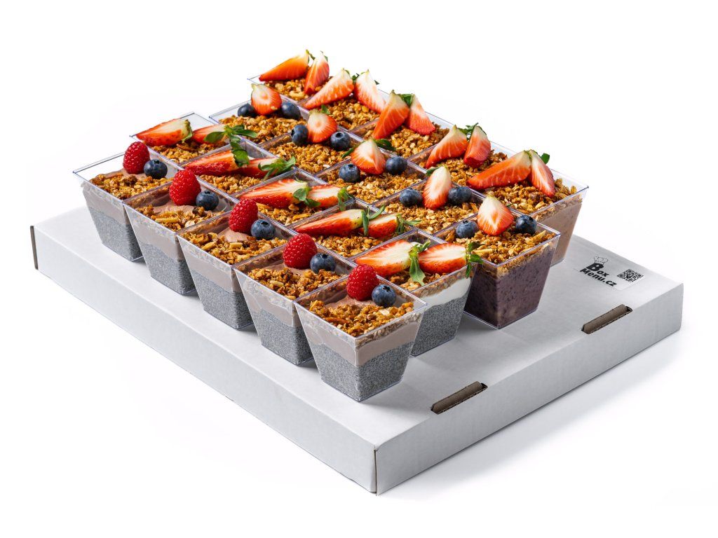 5x chia puding s domácím čokoládovým termixem, domácí granolou a ovocem